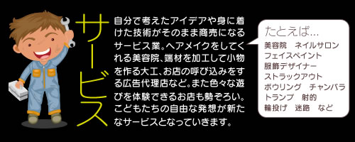 スマイルキッズタウンでは職種カテゴリーを「公共」「飲食」「物販」「サービス」の4つに大きく分類しています。〈注意!〉ここで選んだ職種からの変更はできません。